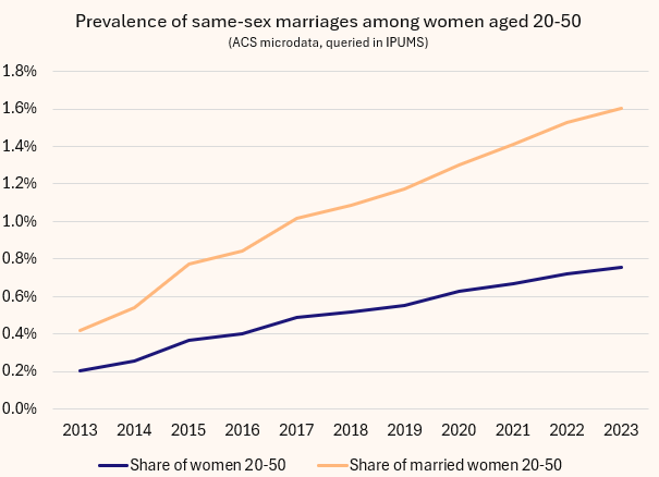 Just since 2013, females married to other females have risen from 0.2% of the female population aged 20-50, to almost 0.8%. Among marrieds, they have risen from 0.4% to 1.6%.
