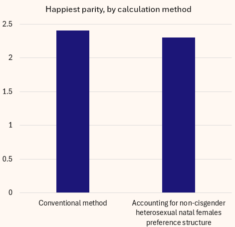 If we tried to estimate “society-wide desired fertility” by summing every woman’s happiest parity and dividing by the number of women, we would be summing the desired fertilities of both women in any possible lesbian couple, and this would produce an estimate of desired fertility vastly exceeding their general ideals for “a family.” This is implausible.
