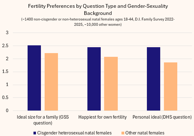 To estimate society-wide desired fertility, we implicitly assume that we can measure just women and this will in turn tell us society-wide desires because men must pair with women to have children. The “men must” part remains true even for surrogacy or IVF, but the measurement part is tricky. We need to know how lesbian women interpret these questions!